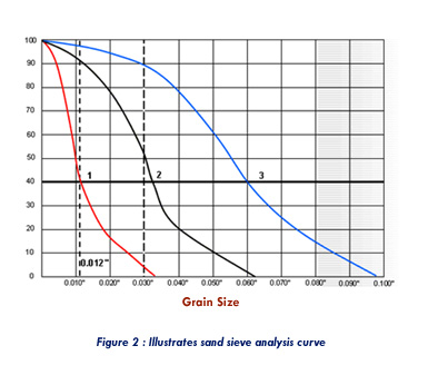 Formation sample retained on each screen is weighed and the results are plotted on a graph paper. It is common to present the grain size distribution plot, expressed in either “inches” unit or “millimeters” unit, as a function of cumulative weight percent of the total sample as depicted on Figure-2.